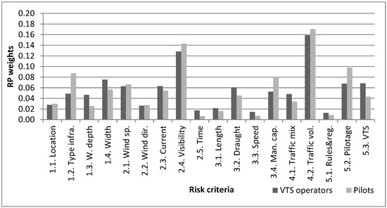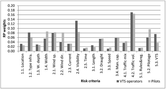 Since VTS operators and pilots might have different risk perceptions, we tested how sensitive the ANP method is to the aggregation of the answers as a unique group of experts. For that, we derived the weights using ANP by considering two sets of answers, one for each group of experts. From the results obtained for each port (see Figure 7 and Figure 8), the weights for each factor have slight differences. In Figure 7, the weights for A1 show that VTS operators perceive that the type of infrastructure and the visibility have a stronger contribution to the navigational risk since they have to guide vessels when they do not have a clear view during their navigation in the port. On the other hand, pilots give more relative importance to the width of the fairways and the wind direction due to the big size of the vessels. Hence, their risk perception is different probably due to their different role in the vessel navigation in the port.