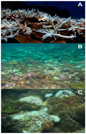 - Spalding, M.D.; Brown, B.E. Warm-water coral reefs and climate change. Science 2015, 350, 769–771. [Google Scholar] [CrossRef] [PubMed]