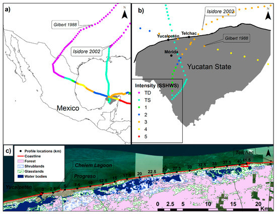 Study area location and selected hurricane events. (a) Hurricane tracks for Gilbert and Isidore; (b) Yucatan state, and (c) Land cover classification for the stretch of the Yucalpetén-Telchac coast.