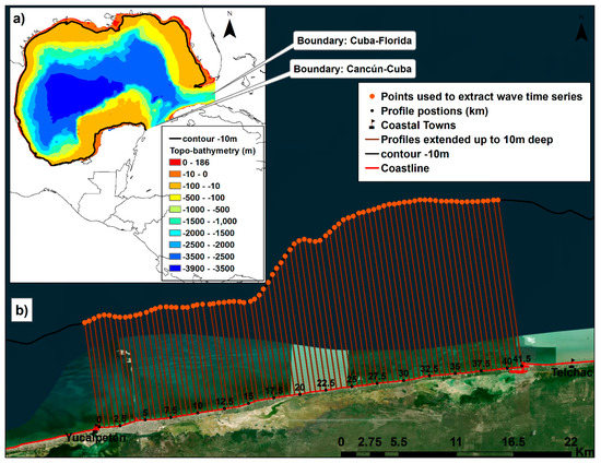 The bathymetry was extracted from the ETOPO1 database [28] and was complemented with higher-resolution bathymetric data from 9-km long transects every 4 km along the coast (Figure 3). In addition, the DET along a stretch of the Yucalpetén-Telchac was used. The model setup was based on previous studies [29,30], which calibrated the model for mean and extreme conditions in the Gulf of Mexico and the Caribbean Sea. Given the direction of motion for Hurricanes Gilbert and Isidore, each profile experiences a different wave height at each time step. To calculate the runup, for each profile a wave height time series was extracted from the computational domain at 10 m depth, as shown in Figure 3b.