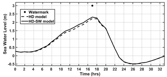 Comparison of water levels reproduced by the hydrodynamic (HD) and HD-spectral wave (SW) models during the pass of Hurricane Isidore at Telchac, Yucatán (México). The starting UTC time (X-axis) was 22 September 2002, at 01:00.