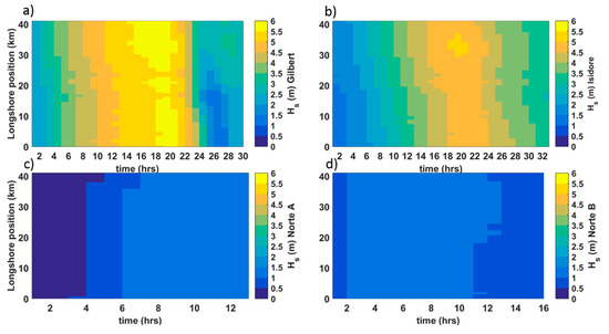 Figure 5 shows the contour plot of the significant wave height at 10 m water depth with respect to the alongshore position (km = 0 is Yucalpetén, and km = 41.5 is Telchac) and time. The starting time (X-axis) for Gilbert, Isidore, Norte A, and Norte B, was 14 September 1988 at 02:00, 22 September 2002 at 01:00, 12 March 1993 at 03:00 and 25 December 2004 at 17:00 in UTC time, respectively. The starting time for each event corresponds to the moment when Rlow > 0. A soft start of 24 h before this moment was employed for each simulation. A maximum wave height of 5.75 m occurred at 10 m water depth during the pass of Hurricane Gilbert. Given the storm tracks, the associated waves were propagated from east to west during the hurricanes’ passage and from west to east during the CACS events. Therefore, spatiotemporal variability is different for each case. Hurricane Gilbert and Norte B were the events with the strongest and weakest wave energy, respectively.