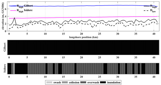 Elevations of Dhihg and Dlow, maximum Rhigh reached at each profile for Gilbert and Isidore (top panel). The highest spatial impact regime at each profile during the pass of Gilbert (middle panel) and Isidore (lower panel) was calculated as swash = Rhigh < Dlow; collision = Dhigh > Rhigh > Dlow; overwash = Rhigh > Dhigh; and Inundation = Rlow > Dhigh.