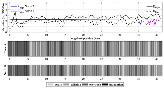 Elevations of Dhihg and Dlow, maximum Rhigh, and associated Rlow reached at each profile for Norte A and Norte B (a). The highest spatial impact regime at each profile during the pass of Norte A (top panel) and Norte B (lower panel) was calculated as swash = Rhigh < Dlow; collision = Dhigh > Rhigh > Dlow; overwash = Rhigh > Dhigh. Note: after km = 35 some profiles did not get wet for Rlow nor outputs of the HD model. Then, the main contribution to the water level for those profiles was the wave runup. Because of the limitation on the interpolation of the topographic data to the mesh, the origin (shoreline) for those profiles are higher than 0.25 m.