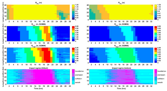Figure 8 and Figure 9 show the temporal variation at each profile location of the wave runup (R2%, (t, y), top row), Rlow (astronomic tide + storm surge + wave setup, second row), Rhigh (third row), and the impact regime (fourth row) for the hurricanes and CACS events, respectively. It is clear that since the highest water levels occurred during Gilbert, the strongest impact (inundation) on the coast was for that event.