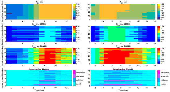 Temporal variation at each profile location of the wave runup (R2%, (t, y), top row), Rlow (astronomic tide + storm surge + wave setup, second row), Rhigh (third row), and the impact regime (four row) for Norte A (left column) and Norte B (right column).