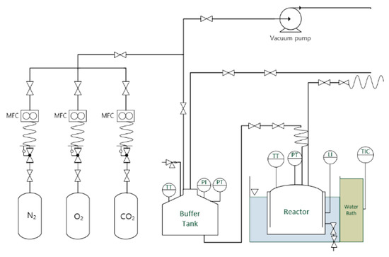 The flow rate of each gas was maintained at a constant level using a mass flow controller (Line Tech, Daejeon, Korea) (MFC) allowing for gas of the desired composition to be introduced into the buffer tank and the reactor. The buffer tank supplied gases of each composition to the reactor after maintaining it at a constant temperature and pressure. The volumes of the buffer tank and reactor were both 9 L. The temperature and pressure of the buffer tank were measured using a thermocouple (Sunil Instrument, Busan, Korea) (TT) and pressure transmitter (Wika, Germany) (PI, PT) with 99.5% accuracy. Thermocouples (TT) and pressure transmitter (PT) are used to measure pressure and temperature, which are variables used to calculate the gas phase moles of a reactor.