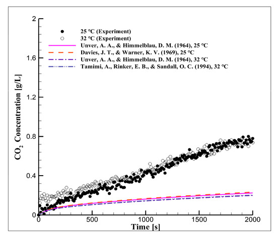 Figure 3 shows the CO2 concentration in distilled water over time according to the equilibrium pressure and temperature. Figure 3 shows that the diffusion and dissolution velocity of CO2 were related to temperature. The observed concentration, using the diffusion coefficient values obtained from the literature (Table 3), was compared to the experimental results. The results of the experiments were in good agreement with those of the simulation in terms of the CO2 concentration at the beginning of the experiments, but this agreement deviated over time.