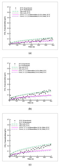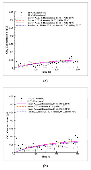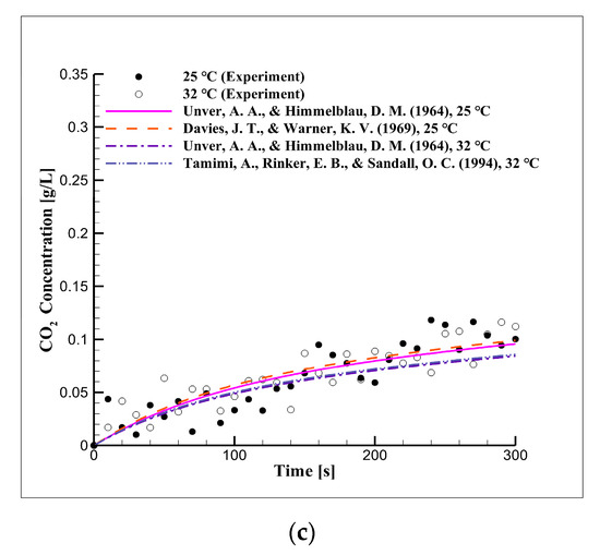 For the diffusion coefficient values presented in Table 4, the jet method was used as the experimental method. In this case, a very short contact time and high liquid velocity were used [40]. The diffusion coefficient values of CO2 and water used for numerical analysis are listed in Table 4. The average standard deviation of the reported experimental values was 0.1 × 10−5 cm2/s at 25 °C.