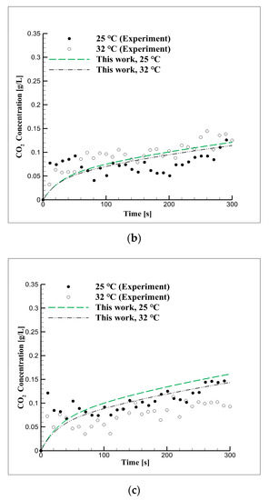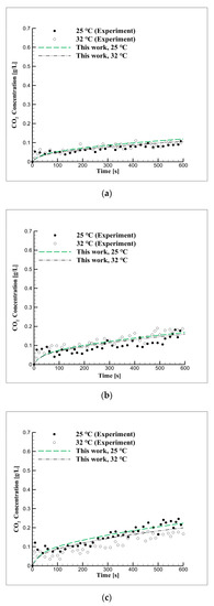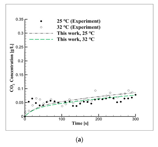 Figure 6 shows the concentration of CO2 in seawater over time, up to 600 s under equilibrium pressures of 2, 3, and 5 bar and temperatures of 25 and 32 °C. When the numerical analysis was conducted by applying the diffusion coefficient values selected from Figure 5, the concentration of CO2 increased with the increase in equilibrium pressure, which is in good agreement with the experimental results. The diffusion coefficient in seawater was approximately 17% lower than that in distilled water. Many ions and types of organic matter exist in seawater and the CO2 diffusion coefficient decreased as the total dissolved solids increased. Moreover, the concentration of CO2 in seawater decreased with the increase in salinity and the diffusion coefficient in seawater was low because of limited CO2 diffusion. When CO2 is dissolved in water, it is divided into and . These components have different diffusion coefficients whose effects become visible over time [46,47].
