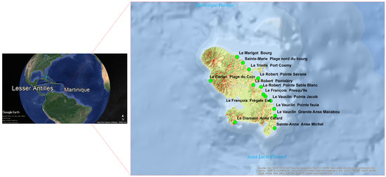 Martinique Island, Lesser Antilles: Distribution of the coastal sites where the Solarcam system has been deployed.