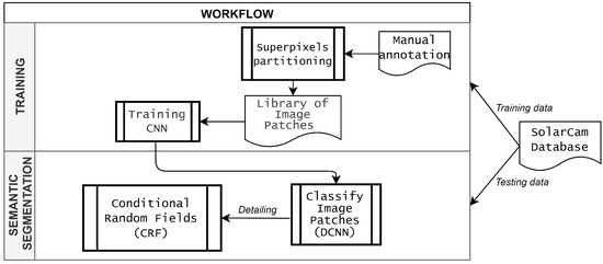 SolarCam images are used for superpixel partitioning, CNN training, superpixel-based classification with CNN, and finally refining via fully-connected CRF.