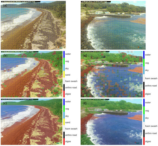 Examples of the three steps aiming at image semantic segmentation applied to two images, representative of the two main categories analyzed, beach morphology and harbour-type cover, left and right side, respectively. (a,d) Superpixel partitioning by the sticky-edge adhesive algorithm; (b,e) CNN superpixel classification; (c,f) The final semantic segmentation by means of fully connected CRF refinement of the CNN classification.