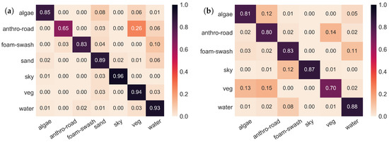 CNN + CRF pixel-scale classification results. The ground-truth data are represented on the y-axis, the predicted ones on the x-axis. The lateral bar maps the percentage of data classified. (a) The beach category of the testing database; (b) The harbour-type category.