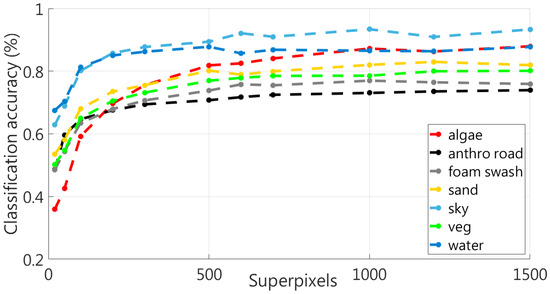 On the basis of the above analysis, it can be summarized that there was a clear scale effect in the final classification accuracy. This was particularly true in the regions with high complexity (e.g., algae). That is, the deep features appeared less valuable at large scales as there was major variability and lower consistency. There is no definite evidence to suggest that there is a unique superpixel scale for all optimal classifications in each class.