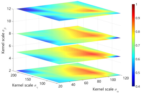 A large range of values which led to solutions having accuracies greater than was found for kernel hyperparameters and , while a smaller amplitude of admissible values was related to . To some extent, the former models the standard deviations for the location component of the color-dependent and color-independent kernels. The latter is related to the standard deviation for the color component of the color-dependent term, and it appeared to have a much greater impact on the acceptable accuracy. The values chosen for use in the evaluation phase presented above were .
