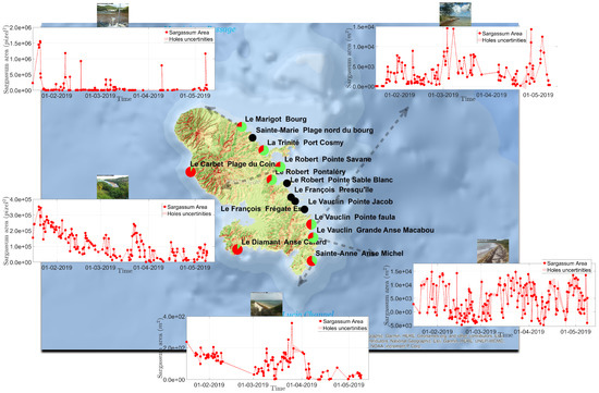 In the same Figure 7, time series of floating/beached Sargassum for a few sites as examples are drawn on top of the map. The red lines represent the temporal evolutions of the pixel/real-world areas computed every 3 h (red points) at each station, while the shaded red curves on top of the red lines, referred to as the “holes uncertainties”, are computed as tiny regions inside the great algae spots, which are perceived as questionable predictions.