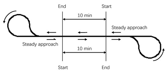 Figure 4 shows an illustration of the ship’s track during the Double Runs. The steady approach was long enough to ensure that the tested ships are in a steady condition prior to the commencement of each speed run. The test duration was 10 min for all speed runs.