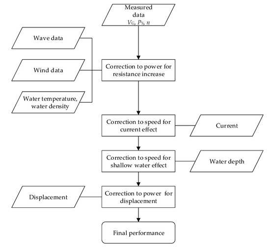 For each run, the total resistance increase associated with the measured power is calculated. The total resistance increase comes from relative wind, waves, and deviation of water temperature and water density. Then correction to power due to the total resistance increase is conducted based on the ‘direct power’ method. Additionally, the current effect is corrected by the ‘iterative’ method, the shallow water effect is corrected by the ‘Lackenby’ method and the displacement effect is corrected by Admiral-formula which applied to the power values. Finally, the ship’s performance in terms of ship speed, power and shaft revolution under ideal conditions could be obtained.