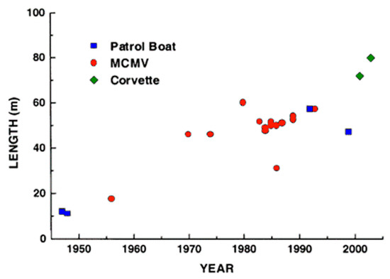 Plot of vessel length against the year of construction for all-composite patrol boats, mine-countermeasures vessels (MCMVs) and corvettes against the year of construction [5].