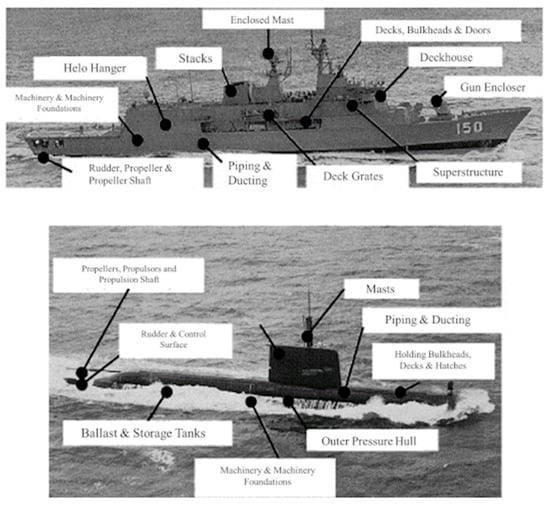The United States Navy first introduced a fairwater entirely made of GRPs on the conning tower of a “Guppy” class submarine. These parts, traditionally made of aluminum, undergo severe corrosion and require continuous ongoing maintenance and repairs. The composite ones resulted in more durable requiring reduced maintenance. As a result, more than 25 Guppy class submarines were equipped with composite structures between 1950 and 1970. Composite materials are also considered for internal applications within a pressurized submarine, including bulkheads, decks, hatches, main propulsion shaft, ballast tanks, tanks, machines, pumps, valves and piping [4]. Figure 2 summarizes the applications on military ships and submarines where the composite materials are currently employed or under development [1,5,6].
