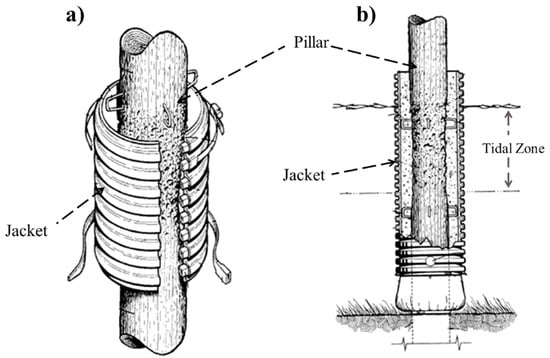 Repairing techniques, especially in the case of emergency repairs, are in continuous evolution aiming to develop new adaptable and versatile methods. To date, several fiber-reinforced composites are now available to achieve an effective restoration of damaged marine structures. As an example, a wearable FRP jacket able to provide support to any pillars is proposed in [54]. This solution consists of a coating that can be installed around a damaged pillar, without using prepregs layers or even in-situ impregnated fibers. High-density polyethylene pipes cut along the longitudinal direction are used and glass or nylon reinforcing fibers arranged in a transverse direction. The polyethylene pipe is very flexible, allowing it to be applied to the pillar without the use of hinges and without incurring fractures of the material. Figure 7 shows the scheme of the reinforcing jacket applied to the wooden pillar.