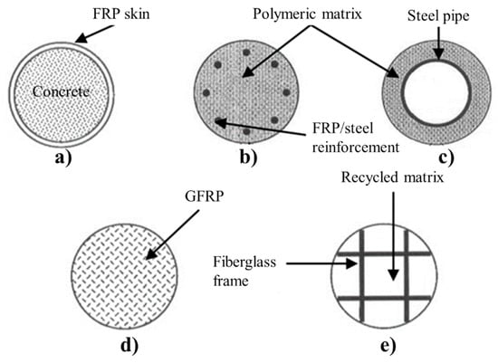 The coating layer present external undulations, necessary to increase the stiffness and strength of the structure and to facilitate joining and fixing operations. The reinforcement fibers are placed inside the undulations. The junction between the substrate and the reinforcement is guaranteed by concrete, which acts as a filler to repair any cracks on the surface and as a binder. FRP composites are being increasingly used not only as reinforcement or repairing materials but also as a structural element for the construction of pillars in marine environments replacing aluminum, steel, wood, and PVC. Recent literature points out that five types of composite pillars are currently used as showed in Figure 8 [65]: