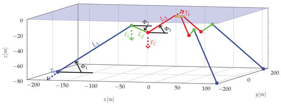 where X and Z are the horizontal and vertical distance from the anchor, respectively, while and are the net force of the clump weight and jumper, respectively, obtained as the balance between their weight and buoyancy. The horizontal distance of the midpoint of line to the anchor is , for , while and are the horizontal distances of the jumper and clump weight from the anchor, respectively. Such parameters are simple linear combinations of the five unknowns of the system, which are: Tension at the buoy (), tension at the anchor (), and angles of each line to the horizontal direction , as shown in Figure 3. Knowing the tension and the angles of each line, it is possible to compute the total force and total torque acting on the buoy. Note that the nonlinear system of five equations in (18) is solved numerically, since no explicit algebraic solution can be obtained.