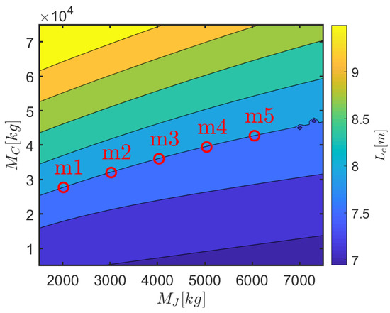 Map of jumper mass () and clump-weight mass () to the resulting draft of the top cylindrical section of the floater. Five different configurations are studied ( to ), as tabulated in Table 4, all resulting in a draft of 7.91 m.