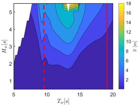 Mean displacement in surge due to drift effects for configuration as a function of and . The dashed and dash-dotted red lines correspond to and , respectively.