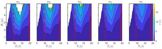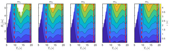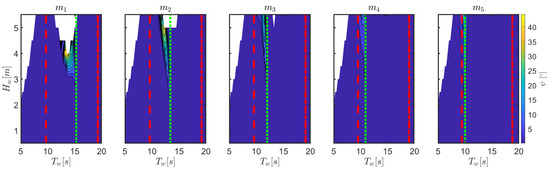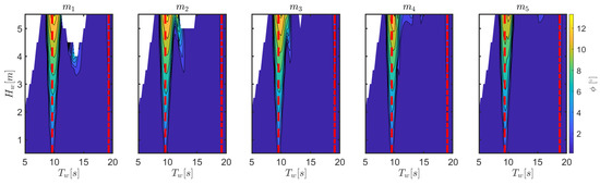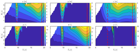 Note that in Figure 5, as well as in all following contour plot figures, the top left corner presents no data, since those points realize a combination of and with a steepness higher than the 6% threshold. The larger mean drift in surge is found for a range of between 10 s and 15 s, in a region where large heave amplitudes occur. Figure 6 shows the amplitude of the response for configuration , also highlighting where the wave period is and . The most remarkable result is the evident parametric resonance happening, as expected, at around . Simulations show that the range of wave periods where the roll is internally excited widens as the wave height increases, since greater incoming energy overcomes the internal damping more effectively. Since sway is coupled with roll, there is also a clear peak of the sway amplitude response across the same range of periods. Furthermore, note that also pitch engages into parametric resonance, since they have the same natural period due to the axisymmetric shape of the floater. Unlike roll, the range of wave periods in the pitch response with large amplitudes does not widens with the increase of . It is likely that the external excitation of pitch due to wave action limits the level of energy capable of being absorbed by this mode, and in this case, the energy surplus is transferred to roll. Although the impact on the heave response is less evident, it can be noted that, when parametric resonance occurs, there is a drop in the heave amplitude, which is ultimately detrimental for power extraction. Finally, an isolated peak of yaw response can be found near , suggesting that yaw can also be subject to a parametric-resonance-type effect.