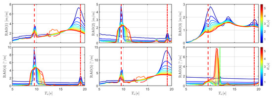 In order to highlight the effect of nonlinearities, it is also interesting to consider the response amplitude operator (RAO), defined as the amplitude of the response over the incoming wave amplitude, as shown in Figure 7. Note that the RAO would be insensitive to the wave height only for a fully-linear system. The widening effect of parametric roll response is particularly evident in the RAO curves of roll and, consequently, sway. The decrease of the RAO roll peak with increasing indicates an increasing importance of drag due to viscous effects in the limitation of that motion. The heave RAO presents two peaks near the buoy and OWC natural periods.