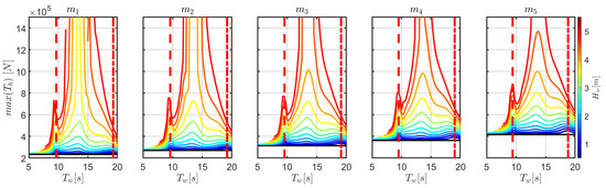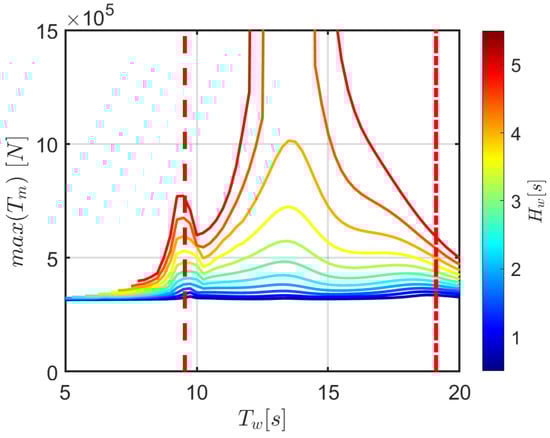 Figure 10 shows the peak load on the front line at the fairlead. While the color bar represents different wave heights, the bottom black line represents the line pre-tension. Similar trends to Figure 8 are found, with a local maximum at the period where parametric resonance occurs and another peak at about 14 s, where the mean surge displacement is significant. Although the pre-tension increases from to , the peak loads remain approximately unchanged, meaning that tension oscillations on the line are reduced, which is favorable for fatigue resistance. However, as survivability conditions draw closer, higher loads arise for configurations with a lower pre-tension.