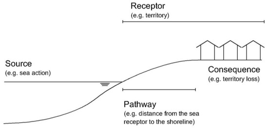 The source-pathway-receptors-consequence (SPRC) model [54] was adapted by [30], from coastal flooding to coastal erosion, to propose CERA. This model is used to link various components of a system, helping in the identification of how risk propagates. Therefore, for risk to arise, it must exist a source that triggers the hazard, a pathway that the hazard takes until reaches the receptor, which may be harmed by it, culminating in the consequence provoked by the hazard (Figure 3). Using the SPRC model, each part of the model corresponds to a component of risk estimation [55]. Therefore, an assessment on source conditions should be done to evaluate the hazard probability. A pathway assessment correlates to the degree of exposition and a study of the receptor is required to evaluate how susceptible they are to the hazard. The consequence will vary depending on the value present in the study area.
