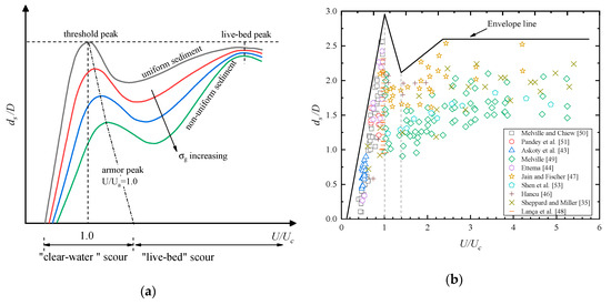 When it comes to non-uniform sediment, the armor layer will take part in. Baker [56] observed that the maximum local scour depths occurred at . Raudkivi and Ettema [57] found the armoring effects affected local scour in two different types. One was bed armoring, which was responsible for bed forms. The other was scour hole armoring, which would reduce the local scour depth. For the difference between the armor layers in the scour hole and on a streambed, Raudkivi and Ettema [57] pointed that the former did not have significant fines. The maximum scour depths would not be affected when the gradation coefficient of the sediments was less than 2.0. However, different conclusions were obtained from Melville [44]. Figure 2a presents the experimental conclusions made by Melville [44]. The for green line is about 5. It could be seen that increased with the increasing for a given . Apparently, Melville [44] has a higher credibility. The increasing leaded to a decreasing of threshold peak. Figure 2a is also significant for the influences of sediments. It will be mentioned later in this paper.