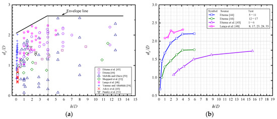 A large number of experimental data have been given by researchers (Table 1). Among the conclusions obtained by these researchers, Melville [50] obtained for independence of through their own experimental data as well as data from Sheppard et al. [53]. To investigate the relationships between and , data was used from Table 1 and presented in Figure 3a,b. For a safe design, the envelope line presented in Figure 3a was recommended. Although more data for deeper flow experiments needs to be studied, the envelope line tends to be a constant value when is larger than 4. When the experimental data was kept for the same conditions except the water depths, a trend was clearly seen in Figure 3b. The test numbers in Figure 3b were numbers where [46,47,50] numbered in their own tests. By collecting these experimental data, the authors found that the relative scour depths increased with the increasing relative water depth until to their own thresholds. Apparently, due to their differential experimental parameters, the threshold values of vary with the researchers. The results of Ettema et al. [46], who obtained the critical value , are consistent with the envelope line in Figure 3a. The others were a little larger or smaller than [39], but were nearby . By analyzing a large number of field data and laboratory data, Park et al. [58] stated that the laboratory data were more dependent on the flow depth than the field data. With flow depth increased, scour depths in laboratory tended to overestimate more than that of the field data.