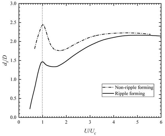 As many physical variables such as flow velocity, shear stress and sediments transport rate are depicted in average, the sediment medium size is widely used as a character in scour and deposition. Melville and Chiew [51] stated that when was finer than about 0.6–0.7, ripples would be formed when the sediments bed was scoured. Then the movement of sediments particles would be affected significantly by the ripples. Later, the relationships between ripples and relative scour depths were obtained by Melville [64]. As is shown in Figure 4, thresholds values of local scour depths occurred in the two curves when flow intensity increased to 1. However, the maximum scour depth for non-ripple forming bed is larger than that of ripple forming. However, when flow intensity surpasses 1, a drop of the maximum scour depth happens in live-bed scour conditions. This is due to the fact that sediments were transported to the scour hole from upstream of the pile just as described in the analysis of flow intensity above. The similar trend was found in Ettema et al. [46], who concluded the maximum scour depth was 0.3–2.3D, depending on the distributions of the sediment sizes. Chiew and Melville [62] argued that the formed ripples on bed were responsible for these variations. Ripples made bed more roughness and increased quantity of sediments particles transported from upstream, resulting that more sediments particles were transported into scour hole around the pile.