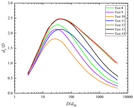 The influences of sediment medium size d50 on scour depths have been developed to a deeper understanding. In early years, many researchers believed that the relative scour depth increased with the increase of relative medium sediments diameter when was smaller than 25–50. When it surpassed 50, would be independent with . Nevertheless, with relatively larger flume experiments and long-time scouring, Sheppard et al. [53] put forward a different view for cases. As is shown in Figure 5, ds/D decreased with D/d50 increased. Later, a similar trend was found by Lee and Sturm [65]. However, what differs from Sheppard et al. [53] is that when , is independent on it.