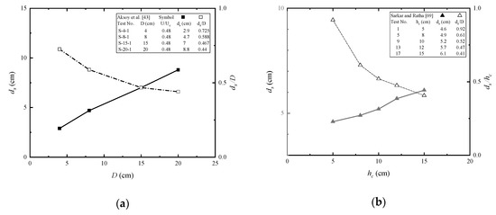 There are many shapes of piles used in engineering, and their effects on the scour are significant. In this paper, only the most popular piles of vertical circular piles and rectangular piles are presented. For unsubmerged piles, their widths have been reviewed and discussed in terms of relative flow depth and sediment size. As is depicted in Figure 6a, scour depth increases with pile diameter. The wider the pile is, the more significantly it blocks the approach flow, and thus forming a deeper scour hole in vicinity of the pile Sarkar et al. [66]. However, when the scour depth is normalized with pile width, it decreases. This trend can also be viewed as the rate of scour depth with pile width. Sooner or later, the rate will tend to be zero, and thus a threshold of scour depth for independence on pile width will be obtained. For the influence of pile height (Figure 6b), it is similar with flow depth effect when the pile is unsubmerged. In the submerged conditions, scour depth increases with pile height when the other factors are kept the same.
