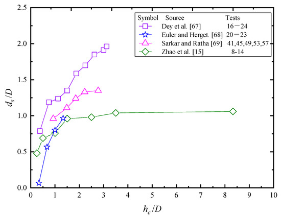Figure 7 was drawn with data chosen from Table 2, each of which was controlled with its same sediment characters , , flow intensity , water depth h and scour time t. It can be seen that the dimensionless scour depth increases with the relative pile height hc/D when is smaller than 3–4. Except the diamond data from Zhao et al. [15], which was in live-bed scour condition and fitted with a blue line, there is not a curve reflecting the independence of for . Zhao et al. [15] found the maximum scour depth was independent with when was larger than about 2. The vortices shedding behind the pile was weakened when the height of the pile was small. No scour was seen behind the edge of the pile when was smaller than 0.25. With numerical simulations methods, Zhao et al. [15] obtained shear stress around the pile, and found a significant decrease in smaller value of .