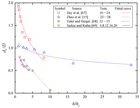 The relationships between h/hc and ds/D for submerged cases are also investigated by a few researchers. According to Hunt et al. [1] and Tsutsui [70], there was a reverse flow and a separation bubble on the top of the pile instead of the anti-clockwise damming in front of the pile when the pile was submerged. The additional water down wash flowed on the side and behind the pile. Consequently, local scour for submerged piles or structures needs to be studied too. However, as far as the authors are aware, local scour researches in submerged vertical piles were only seen in [4,15,67,68,69,71]. Among them, influences of flow depth studies were even fewer. Dey et al. [67] observed that an increase in h/hc would reduce the block of flow, and thus the horseshoe vortex was weakened in strength and dimension. They also pointed out that the downward pressure gradient for the submerged pile was less than that of the unsubmerged pile. In addition, the interaction between the free surface and the wake region behind the pile was analyzed by Sarkar and Ratha [69]. They found that free surface was not seen to interact with the wake region when 2.3 < h/hc < 3. However, for h/hc < 2.3, upper layer mixes with wake and intensity increases with Froude number, resulting in a weakened vortices shedding behind the pile. For experimental data in Figure 8, the relative scour depth ds/D decreased rapidly with the increasing submergence of the pile h/hc, especially for clear-water conditions [67,68,69]. It does not seem to stop at some value of h/hc as data of [15].