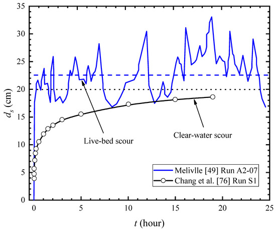 The time for an equilibrium scour varies with flow fields and piles [74]. In live-bed scour conditions, the time needed for the scouring balance is little and accompanied with upper and lower shocks near the equilibrium position [14,71,75]. In clear-water scour conditions, equilibrium needs a much longer period of time. An example for this was presented in Figure 9 in which clear-water scour and live-bed scour tests were taken from Melville and Chiew [51] and Chang et al. [76]. The maximum scour depth increased asymptotically with time and tended to be a threshold value when it was given enough scouring time in clear-water water scour conditions. On the contrary, live-bed scour reached a large scour depth value in very short time and oscillated nearby the equilibrium line, though the maximum scour depth was as much as 15 cm larger than the minimum scour depth when the scour depth was oscillating.