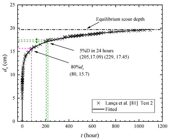 In order to compare these definitions above, a long-time scour experiment numbered test 2 in [81] is selected. The test parameters are shown in Table 3. Comparisons of equilibrium scour depths are calculated with criteria of [16,34,46,77,79,81]. The scour evolutions are presented in Figure 10 and the calculated results are shown in Table 4. The minimum value is from Karimi et al. [79], who stated scouring for 2 hours was enough for equilibrium in clear-water scour conditions. However, Figure 10 shows that scouring for 80% of equilibrium scour depth just needs 80 hours, which accounts for only 7.3% of 1094.5 hours. In fact, it can be seen from Figure 9 and Figure 10 that scour depth reached a relatively large proportion for a very short time in initial stage. In accord with Ettema et al. [46], Melville and Chiew [51] found the scour rate decreased gradually during a scouring process. The scouring rate reached 31%, 38% and 49% respectively within 0.3%, 0.6% and 1.7% of the equilibrium time, while the scouring rate reached 87% and 95% respectively at 33% and 67% of the equilibrium scouring time. Recently, Yao et al. [71] found that flow intensity had a much greater impact in time-scale than changes in aspect ratio.