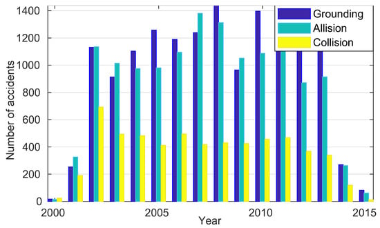 Maritime transport activities shape a new type of economic sector considered as the blue economy []. Since about 90% of the world’s merchandise are transported by sea [], maritime transport plays a central and potential role in economy nowadays. In parallel, safety requirements are continuously improved to avoid hazardous accidents and ensure a sustainable growth in maritime operations. According to the recent annual review of marine casualties and incidents in 2018 [] by the European maritime safety agency, more than 20,000 marine casualties and incidents have been reported at the European level in 2011–2017 only. Together, these accidents caused more than 680 fatalities and over 6800 injuries. Navigational accidents represent 53.1% of all casualties with ships as a combination of: grounding (16.6%), contact (16.3%) and collision (23.2%). Despite being slightly different, the rates of maritime navigation accidents are still tragically high according to marine casualty and pollution database collected by United States Coast Guard (USCG) and provided in July 2015 (not all 2014–2015 accidents reported) by marine information and safety and law reinforcement []. In a total of 34,540 reported and fully investigated navigation accidents between 2000 and mid 2015, around 43.5% of the accidents were groundings, 39.6% were allisions with a static object and 16.9% were collisions as demonstrated in Figure 1. A high-level risk analysis on passenger ship collisions presented in Reference [] suggested that risk control options related to navigation should be considered to reduce the overall risk of collision and that navigational aspects are important.
