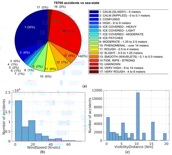 Reported maritime accidents in various environment conditions. Data was from Reference []: (a) Sea state; (b) Wind speed; (c) visibility distance.