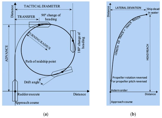 The vessel maneuverability measures the vessel’s ability of stopping, accelerating, varying its course and maintaining a desired trajectory. There are therefore various types of maneuvers a ship needs to execute to satisfy navigation safety conditions. The vessel stopping ability, for example, measures its capacity to stop within a certain distance (the track reach) when full engine astern is applied for a vessel sailing at its full test speed. The maneuverability aspects are therefore tested to ensure that the vessel can safely navigate under worst case scenarios. Full-scale tests are then used to evaluate the ship’s maneuvering performance, which must satisfy IMO standards [] for ship maneuverability.