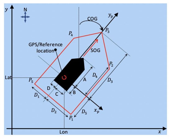 A statistical analysis of AIS data in Reference [] has shown that around 10% of all normal safe situations were performed with a ship-ship passing distance of less than . Considering only near collision situations, this rate is much higher. This implies that the fixed , and ship domains are oversized, especially for large vessels and cases of low speed. In this work, a 5-vertices polygonal domain is proposed as demonstrated in Figure 5 for accurate approximation of blocking areas and for cost-efficient computations in regard of large area analysis and big AIS data.