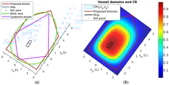 Safety domain for a vessel at 10 knots: (a) Comparison with a quaternion domain and an elliptic domain based on blocking areas; (b) domain with spatial CR function.