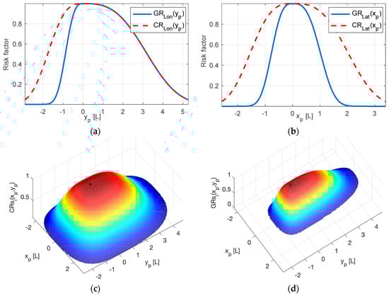 Recall Figure 5 where are projections on the vessel track and is the reference point onboard the ship. The longitudinal risk function is shown in the top-left of Figure 7. The function evaluates to relative risk at the reference point and at the physical ship around (due to the power ^3). The function decays at different rates in front of and behind the ship to a smaller risk factor at and at , respectively. Notice that but , this is logical because the same critical passing distance (e.g., ) between a target ship and own ship implies more danger in case of front passing than in case of passing behind.