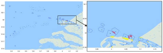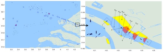 A navigation risk example is demonstrated in Figure 8 in which all vessels are indicated in black surface, their safety domains in blue lines, collision regions in red and grounding regions in yellow. The vessel domain is updated based on the vessel length and maneuverability depending on its speed for which static vessels have a small domain that accounts only for GPS inaccuracy and imprecision, this is a remarkable advantage compared to theoretical fixed L-dependent domains of Figure 4 which are oversized. Since moored vessels usually transmit inaccurate records, they are ignored for grounding risk identification without the loss of generality. In this illustration example, vessel 2 encounters four grounding obstacles that need to be avoided and vessel 3 is navigating under two potential collision candidates and Figure 8 reflects some types of position uncertainties which have been introduced in Section 2.3 as well as unreliable COG for moored vessels and negligible interpolation errors. Indeed, introducing time to Figure 8 and verifying the situation over a few successive instances reflects many vessels were just about one minute to collision for many times.